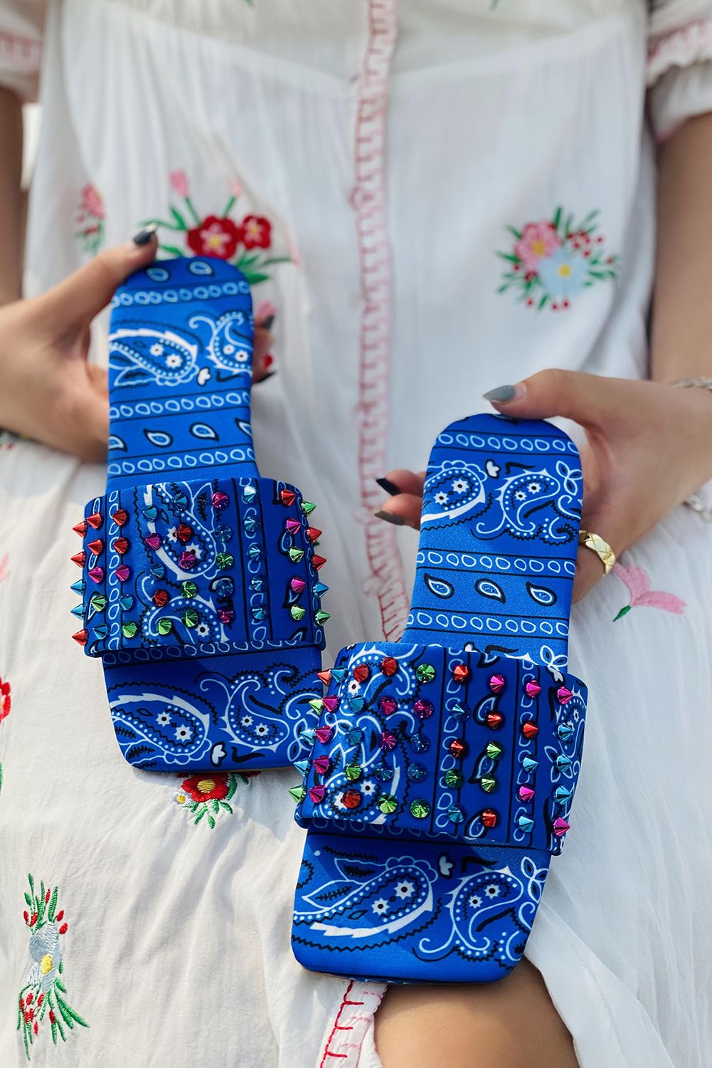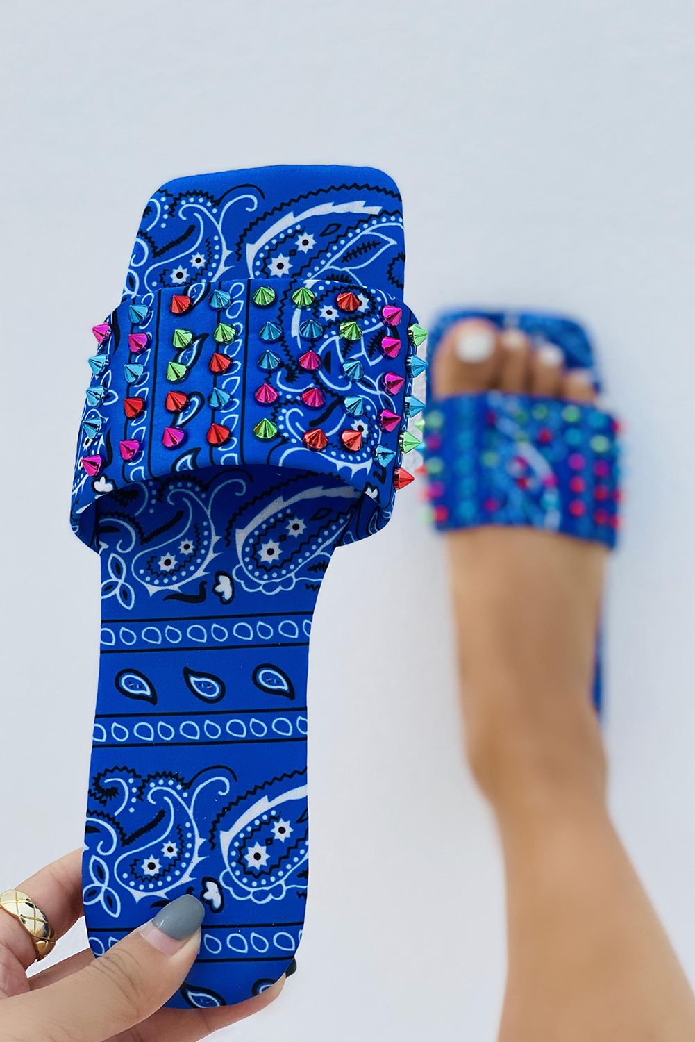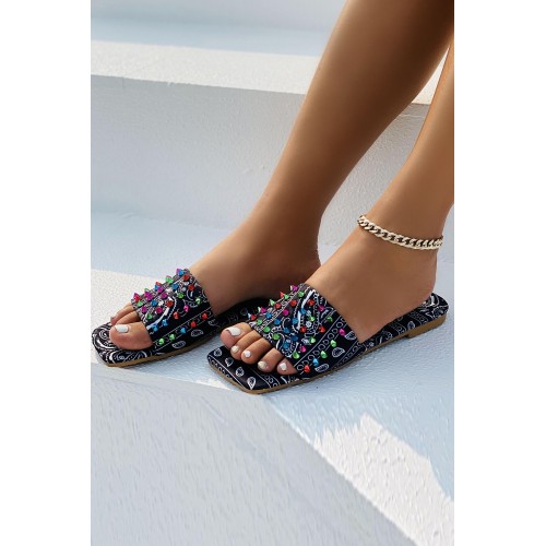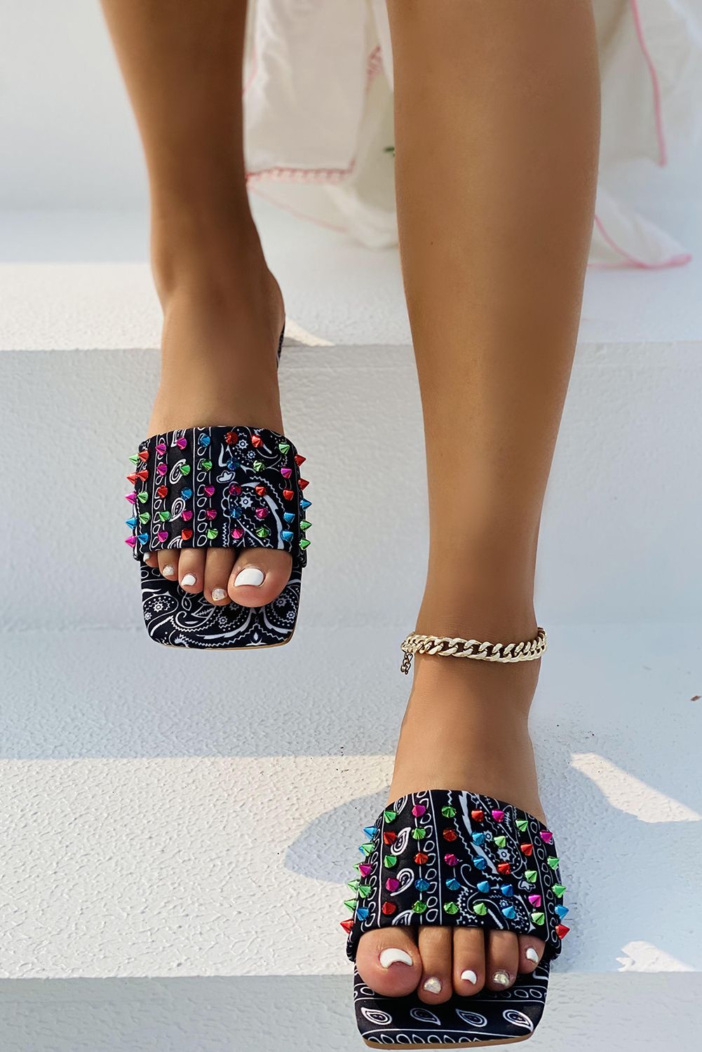 Slippers - Black Square Toe Rivet Paisley Print Slippers