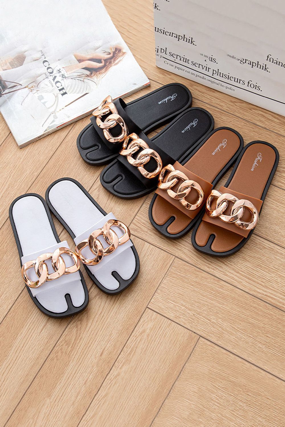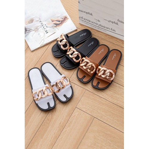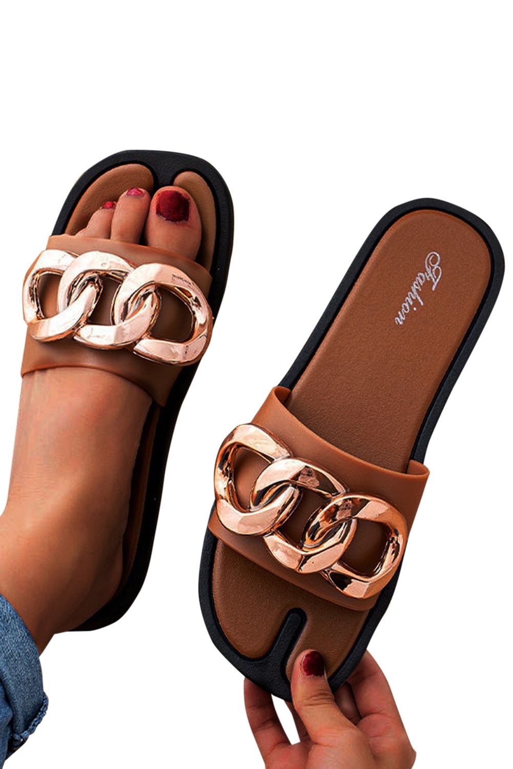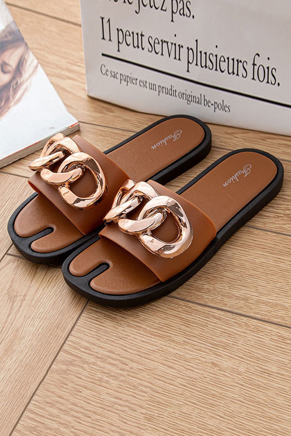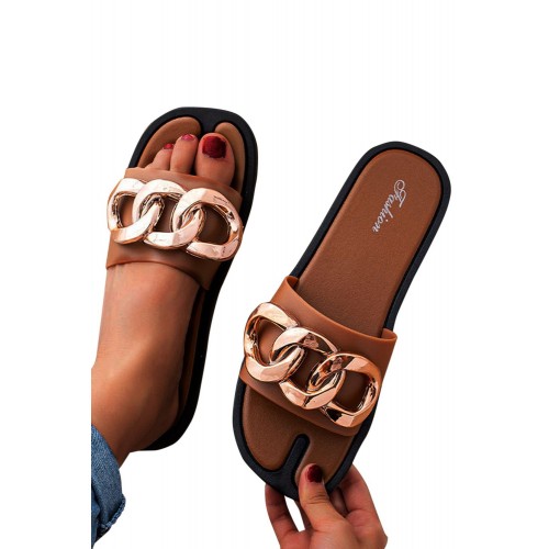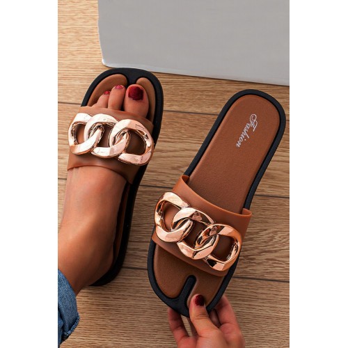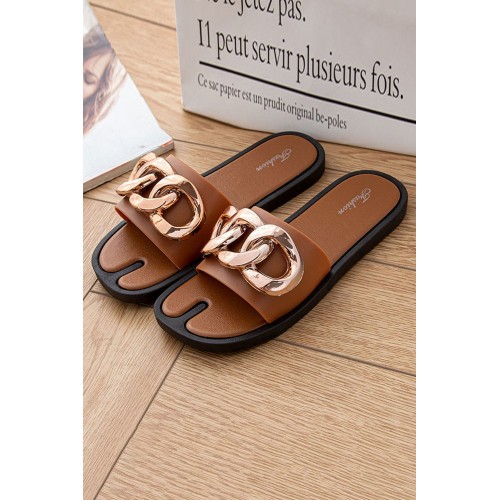 Sandals - Brown Chain Decor Slip-on Flat Sandals