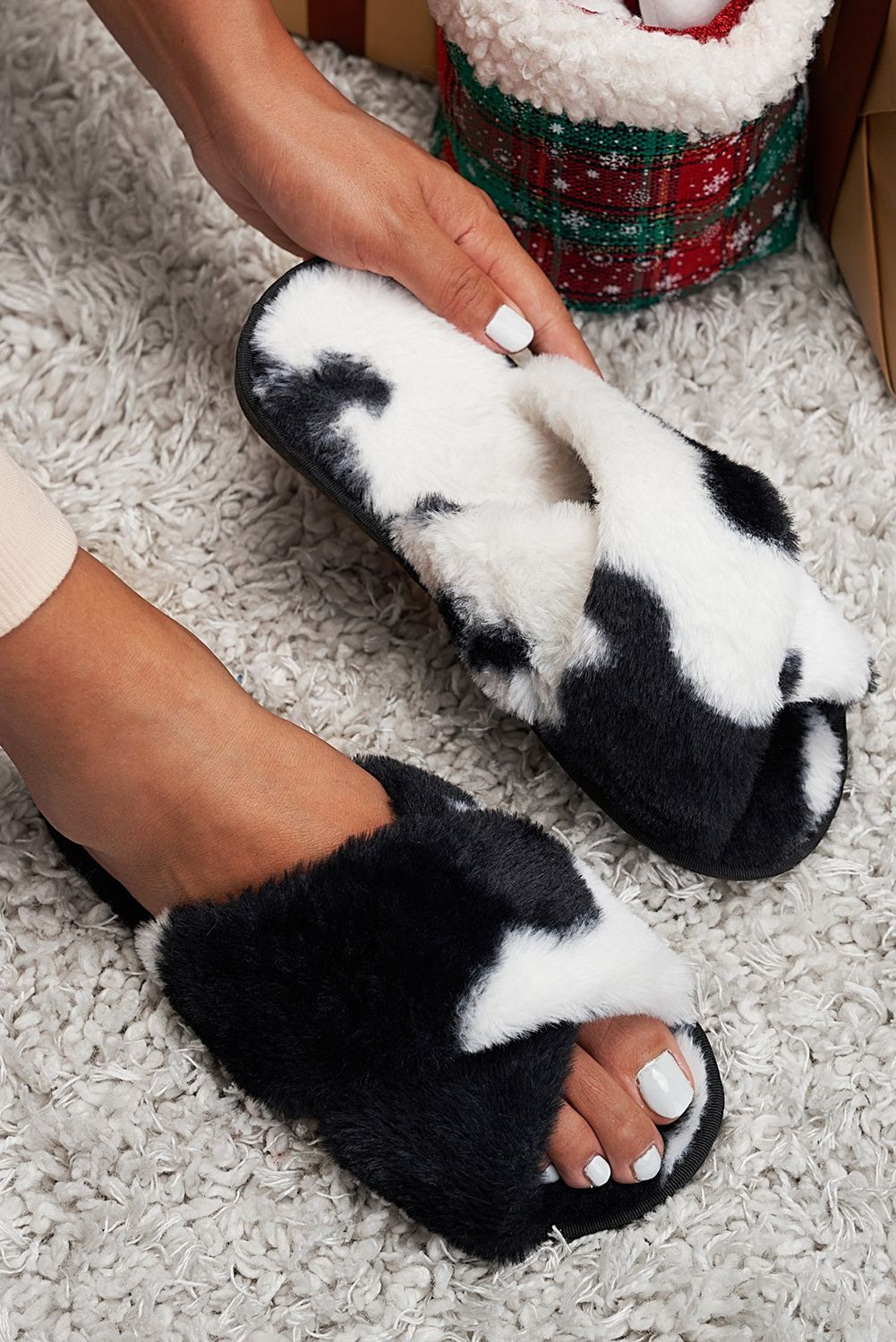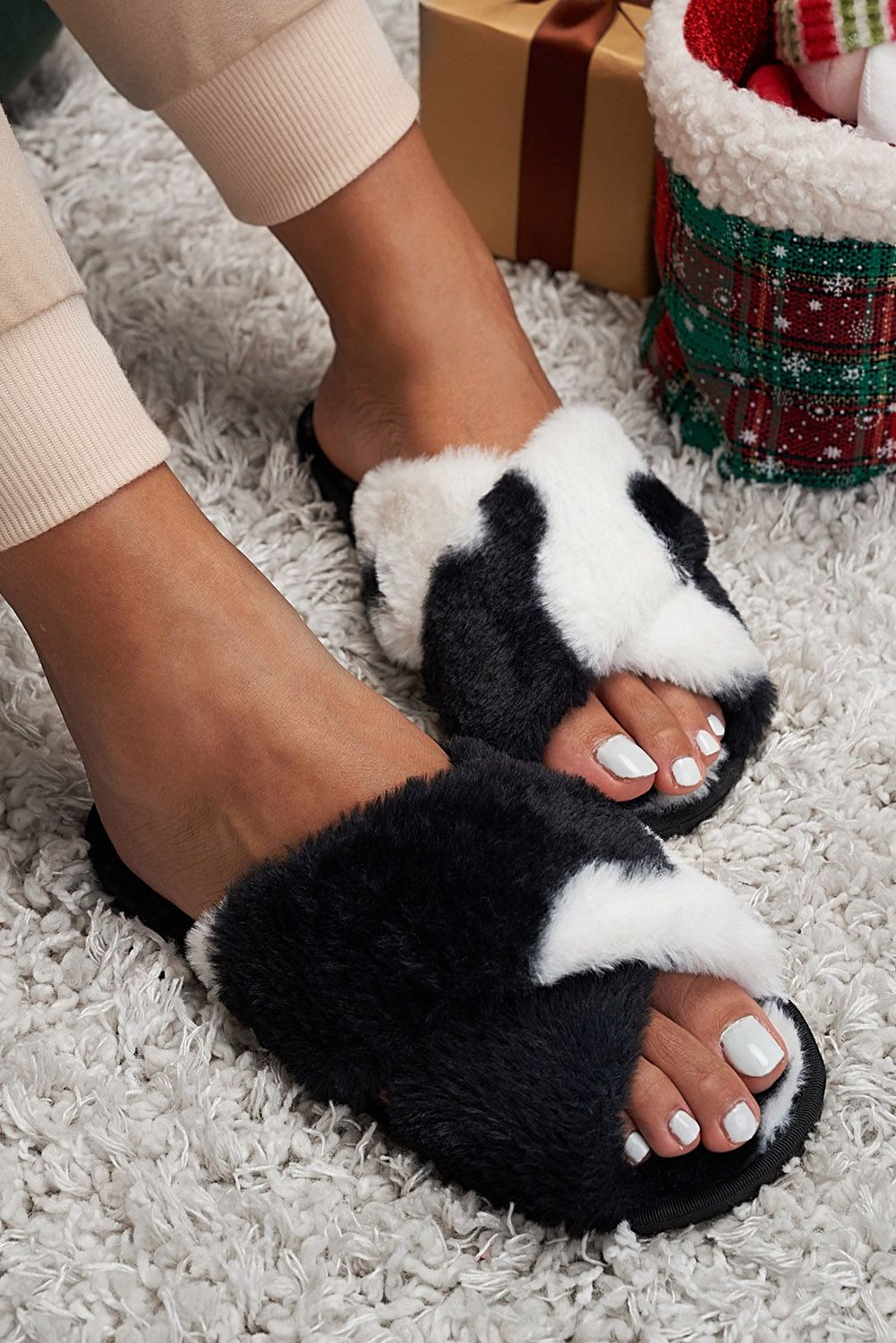 Slippers - Khaki Cross Strap Faux Fur Slider Slippers