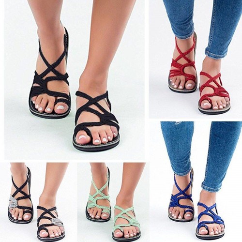 Sandals - Women Flat Sandals Rome Style Flip Flops Cross Weaving Straps Low Heels Ladies Beach Summer Shoes