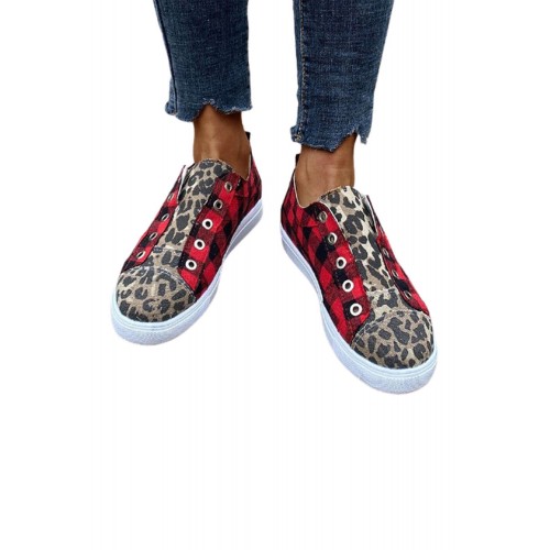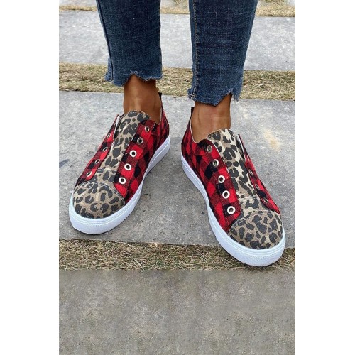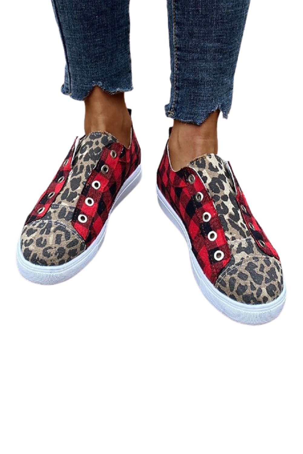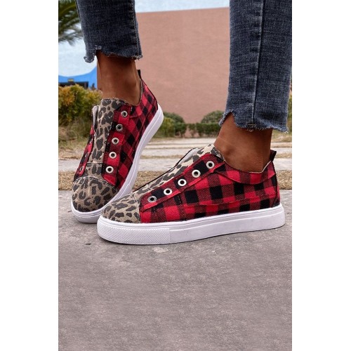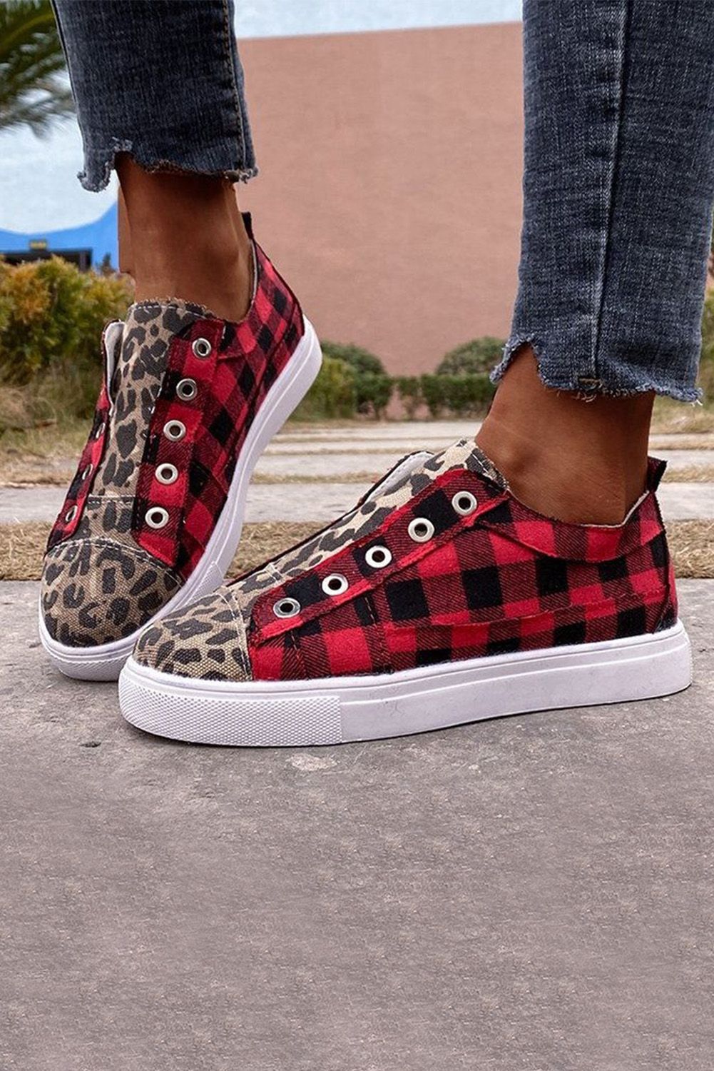 Women's Shoes - Red Plaid Leopard Patchwork Flat Sneakers