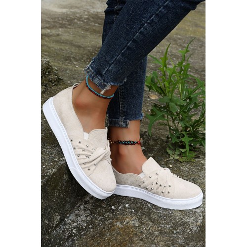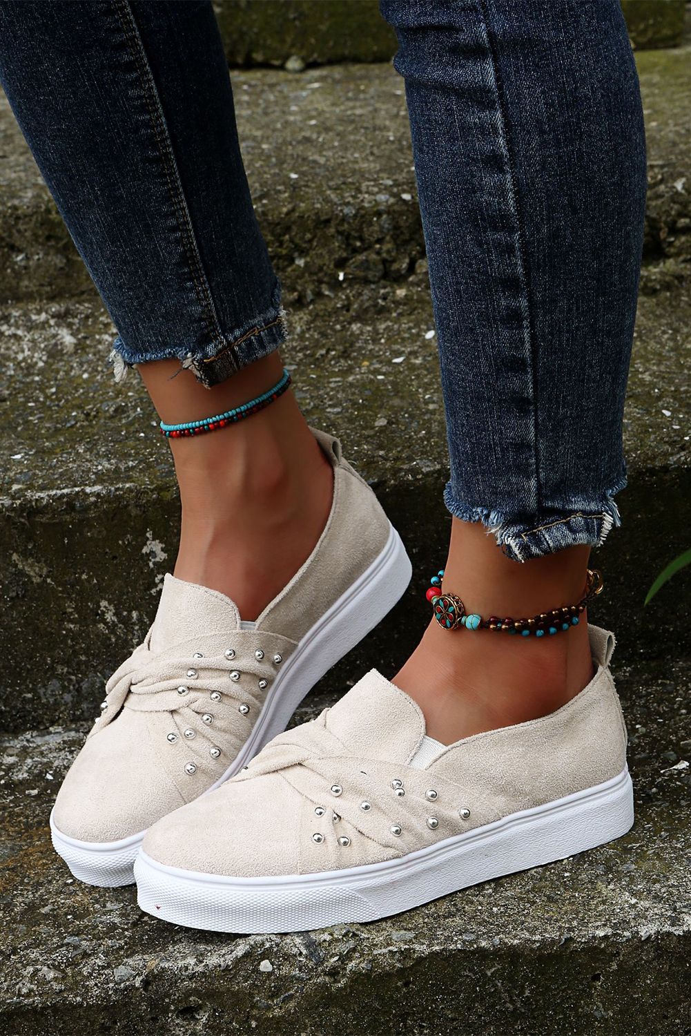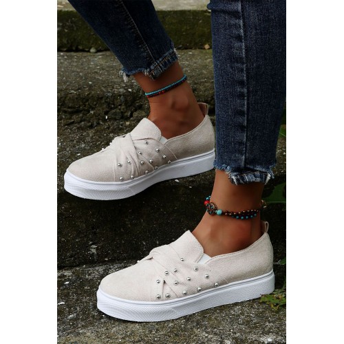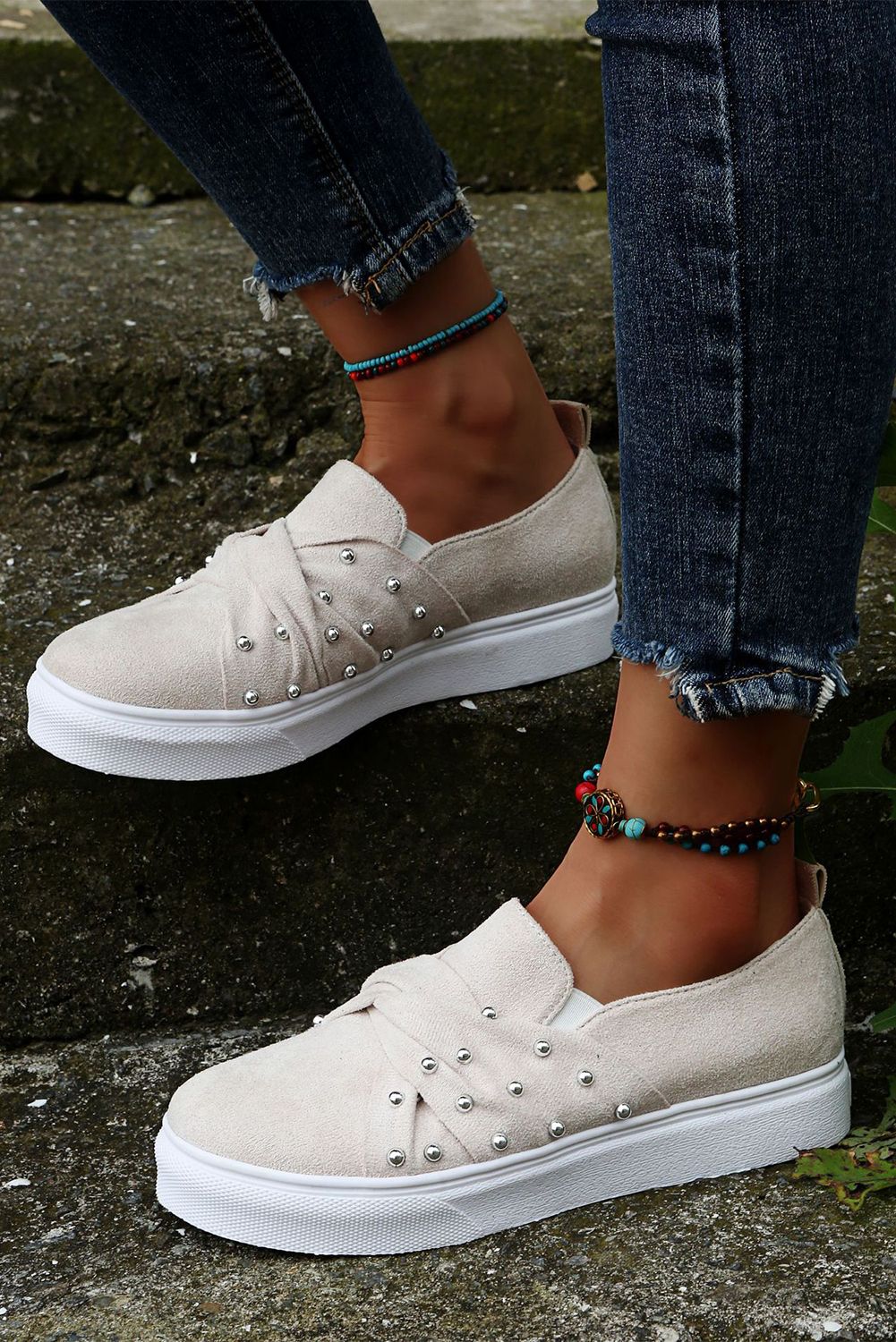 Women's Shoes - White Round-toe Suede Leather Splicing Chic Studded Slip-on Sneakers