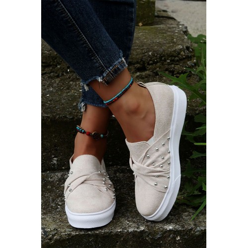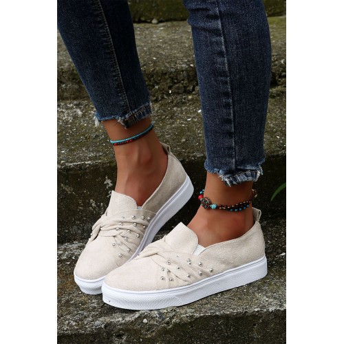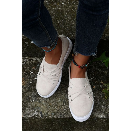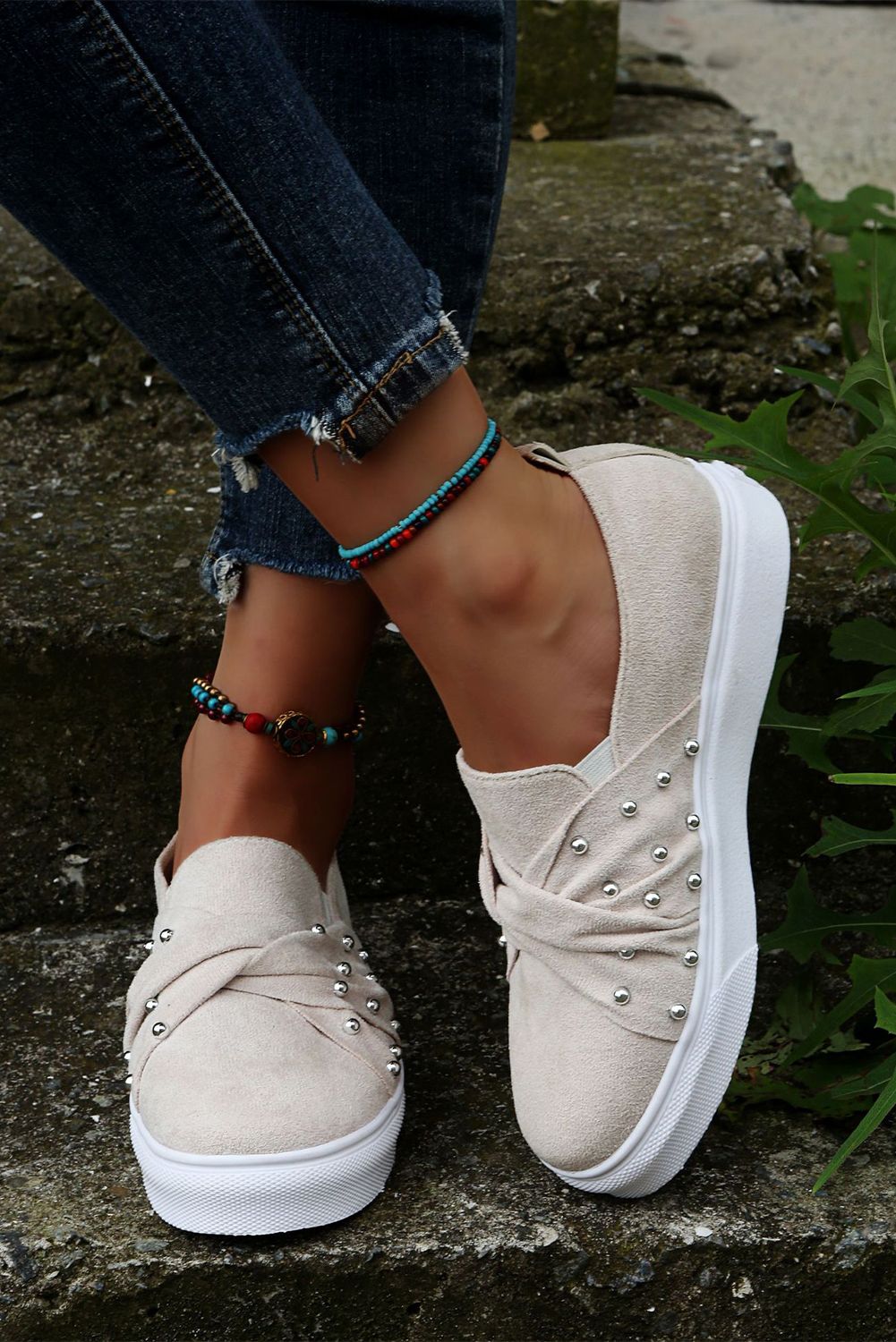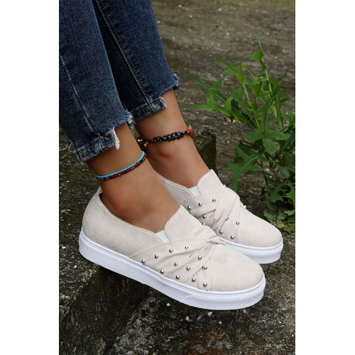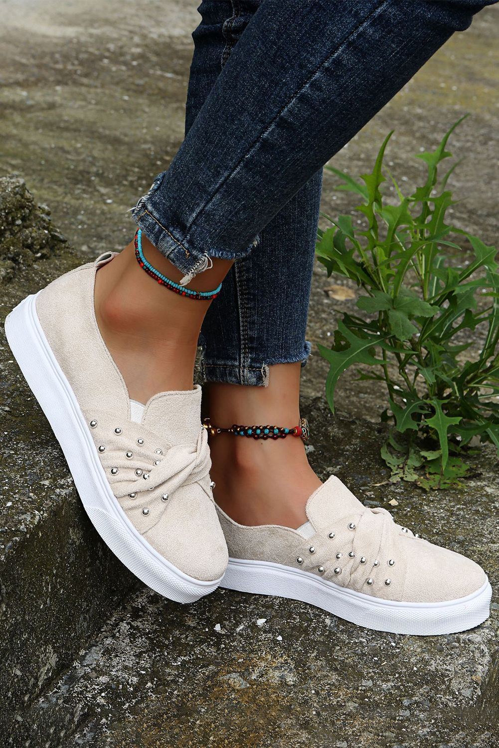 Women's Shoes - White Round-toe Suede Leather Splicing Chic Studded Slip-on Sneakers